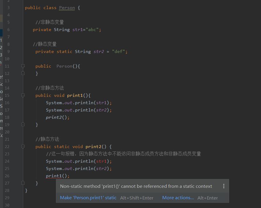 3.static修饰成员方法 简述: ①this关键字不能再static方法中使用 ②静态方法中不能调用非静态方法 ③非静态方法中能调用静态方法
