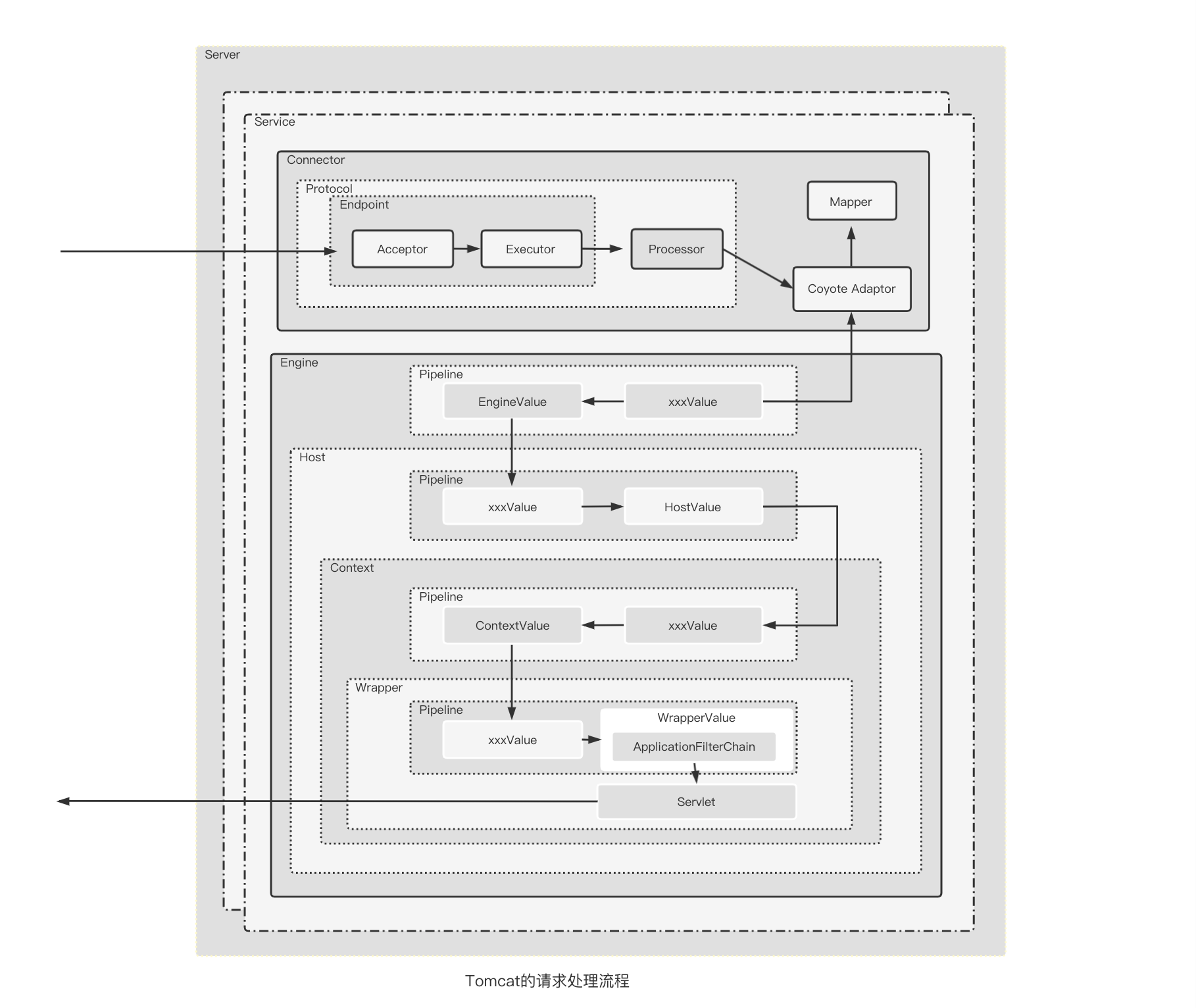 I/O事件就绪 的客户端连接,则将连接交给线程池Executor处理,开始执行请求响应任务 Http11Processor 组件负责从客户端连接中读取消息报文,然后开始解析Http的请求行、请求头、请求体。将解析后的报文封装成Request对象,方便后续处理时通过Request对象获取Http协议的相关信息Mapper 组件根据Http协议请求行的URL属性和请求头的Host属性值匹配由哪个Host容器、哪个Context容器、哪个Wrapper容器处理请求,也就是要找到具体的Servlet。然后将路由的结果封装在Request对象中,方便后续处理通过Request对象选择容器CoyoteAdaptor 组件负责将Connector组件和Engine容器连接起来,把前面处理过程中生成的请求对象Request和响应对象Response传递到Engine容器,调用它的管道Engine 容器的管道开始处理请求,管道里包含若干个阀门(Value),每个阀门负责某些逻辑处理。我们可以根据自己的需求往这个管道中添加阀门,首先执行xxxValue,然后执行基础阀门EngineValue ,它会调用Host容器的管道Host 容器的管道开始处理请求,同样也包含多个阀门,首先执行这些阀门,然后执行基础阀门HostValue ,它继续调用Context容器的管道Context 容器的管道开始处理请求,首先执行若干阀门,然后执行基础阀门ContextValue ,它负责调用Wrapper容器的管道Wrapper 容器的管道开始处理请求,首先执行若干阀门,然后执行基础阀门WrapperValue,它会执行该Wrapper容器对应的Servlet 对象的处理方法,对请求进行逻辑处理(到这里就会调用我们的业务逻辑了),并将结果输出到客户端