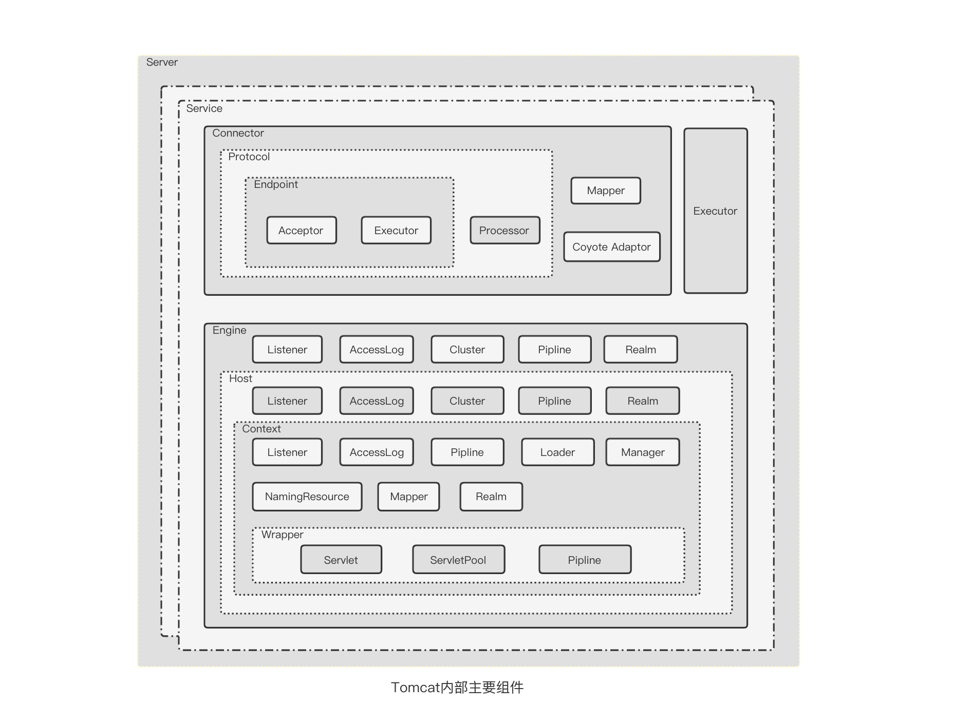 最顶层是 Server ,这里的 Server 指的就是一个 Tomcat 实例。一个 Server 中有一个或者多个 Service,一个 Service 中有多个连接器和一个容器。连接器与容器之间通过标准的 ServletRequest 和 ServletResponse 通信