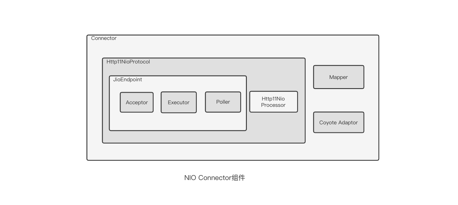 Http11Protocal 组件,是Http1.1版本的抽象,它包含接收客户端连接、接收客户端消息报文、报文解析处理、对客户端的响应等过程;主要由JIoEndpoint组件和Http11Processor组件组成Mapper 组件:客户端请求的路由映射组件,可以将一个完整的路由映射到对应的ServletCoyoteAdaptor 组件,将Connector和Container适配起来的适配器  可以发现,非阻塞模式相比阻塞模式多个一个Poller 组件,该组件的职责是在非阻塞I/O方式下轮询多个客户端连接,不断检测(I/O连接是否就绪)、处理各种事件