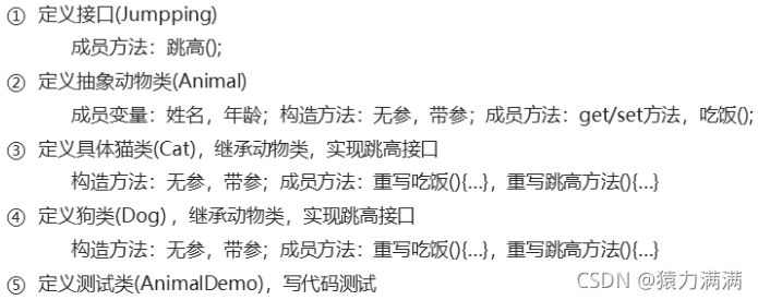 ? 需求:对猫和狗进行训练,他们就可以跳高了,这里加入跳高功能。请采用抽象类和接口来实现猫狗案例,并在测试类中进行测试。