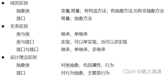 1)成员变量 ? ? ? ? ? ?只能是常量,默认修饰符为:public static final 2)构造方法 ? ? ? ? ? ?接口中没有构造方法,因为接口主要是扩展功能的,而没有具体存在。 3)成员方法 ? ? ? ? ? 只能是抽象方法,默认修饰符为:public abstract ? ? ? ? ? JDK8以后可以有静态方法 ? ? ? ? ? JDK9以后可以有默认方法