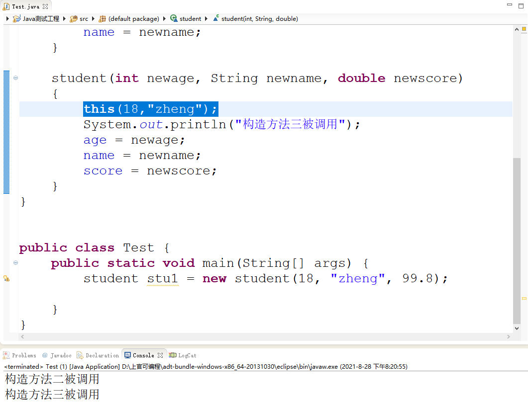 在类的构造方法中可以调用this(【参数列表】)来调用该类的指定构造方法: