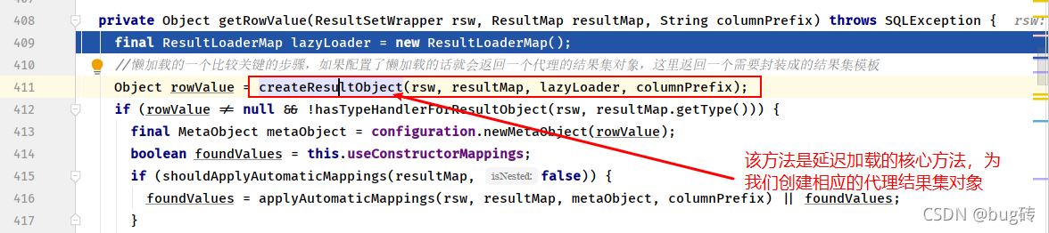 其中我们需要关注的又多出一个对象ResultLoaderMap.class内部维护相应的延迟加载具体实现对象,后面会详细讲解。关注createResultObject(),这里也创建了ResultLoaderMap.class对象后续的讲解都会介绍到该对象,请重点关注下该对象。