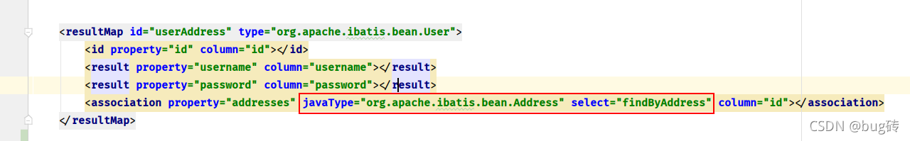 <association property="addresses" javaType="org.apache.ibatis.bean.Address" select="findByAddress" column="id"></association>