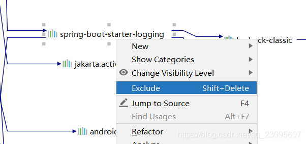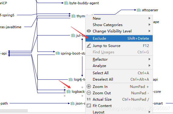 - 找到spring-boot-starter-logging右击选择Exclude即可