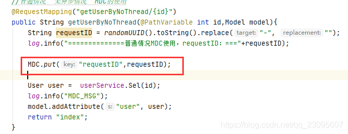 在输出的日志格式加%X{s},s为MDC中的key值,如下,key值为requestID?