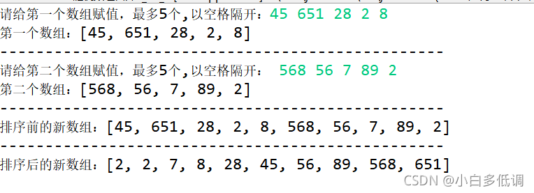 思路:定义三个数组,两个数组自己输入值,第三个数组用来作归并后的数组,先将两个数组的值全部赋给第三个数组,然后将其进行排序输出。