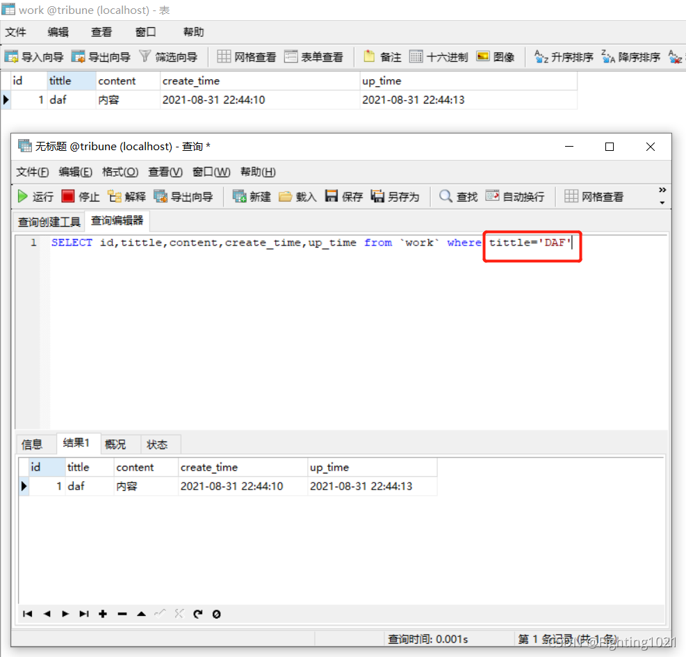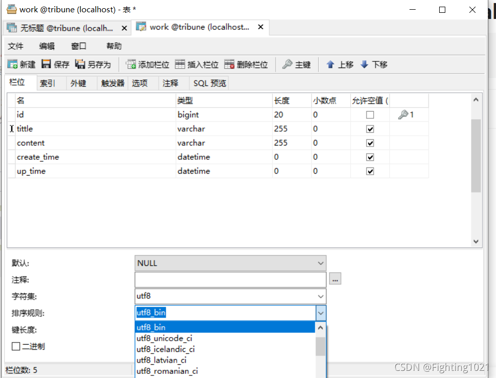 发现问题了吗?对,没错 Mysql它是大小写不敏感的。如果页面填写标题时,全部输入大写的话,按照方法一最终提交是不成功的。因为根据传入标题是能匹配到数据的。我们继续往下看,首先我们看设计表中的字段