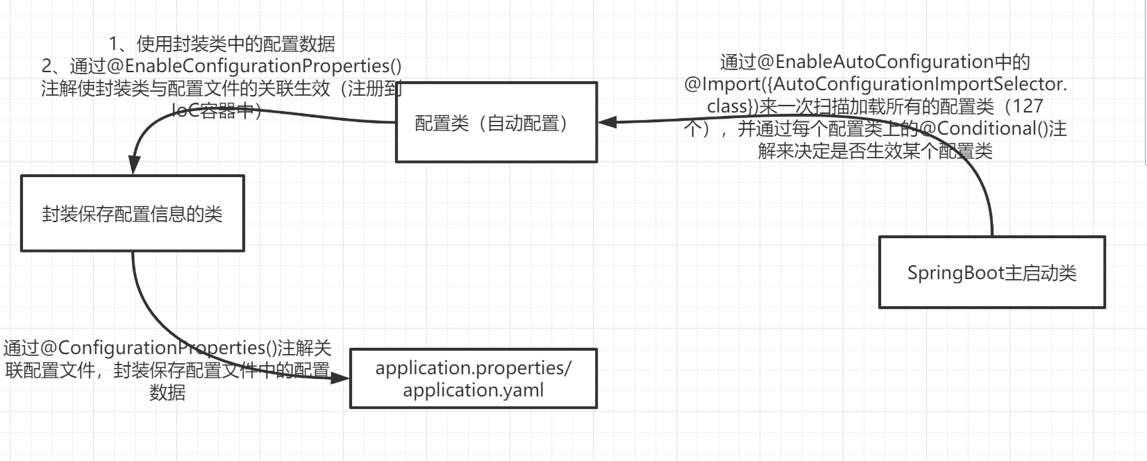 那么所有的配置数据都可以在一个配置文件(既application.properties)中修改,是怎样做到的呢? 是使用这几个注解做到的:@EnableConfigurationProperties和@ConfigurationProperties,这两个注解可以使我们在配置文件中写的数据封装到对应的类里面,这样配置类就能拿到我们写的配置数据了。 SpringBoot实现自动配置的流程图如下: