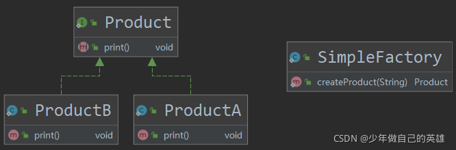 又叫静态工厂方法模式,有一个具体的工厂类,只需要传入工厂类参数,不需要关心创建对象的逻辑,就可以很方便的创建所需产品。