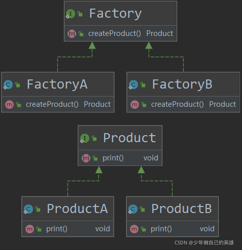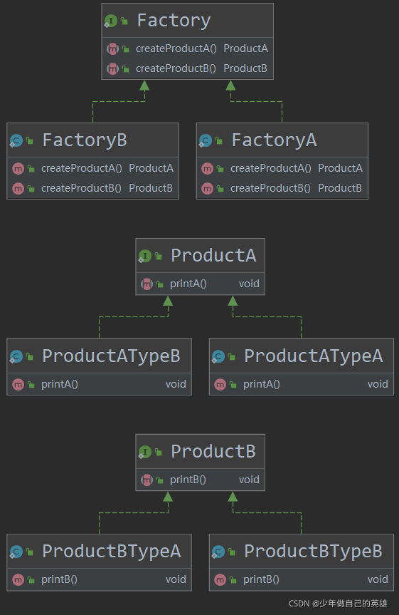 抽象工厂模式是工厂方法模式的扩展,在实际使用中,产品总是按照类型统一出现,而工厂方法模式中,一个子类工厂只能创建一种产品的方式比较鸡肋,我们往往需要一个工厂可以创建出一个类型的多种产品,同时也能降低子工厂类数量的增长速度。