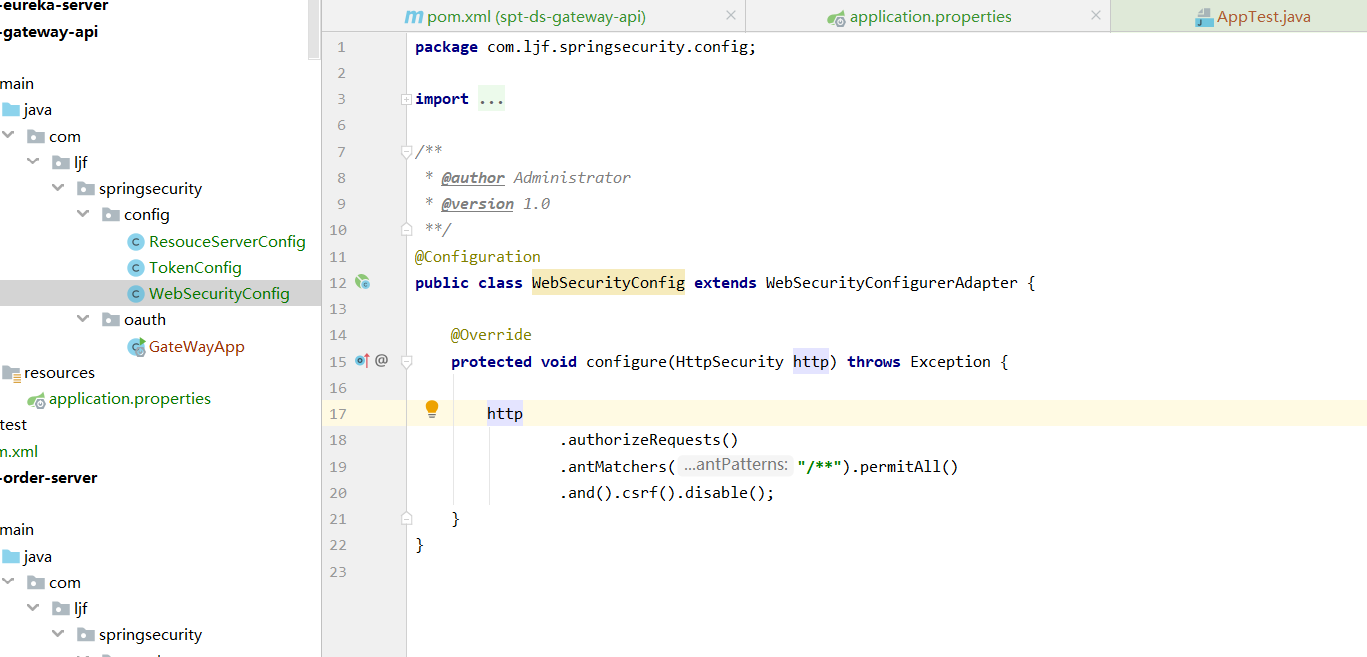 中定义资源服务配置,主要配置的内容就是定义一些匹配规则,描述某个接入客户端需要 什么样的权限才能访问某个微服务,如:
