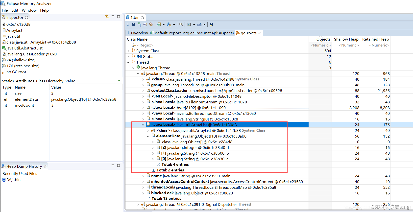 ? 使用 jmap -dump:format=b,live,file=1.bin 16104 命令转储文件 dump:转储文件 format=b:二进制文件 file:文件名 16104:进程的id 第三步:打开 Eclipse Memory Analyzer 对 1.bin 文件进行分析。