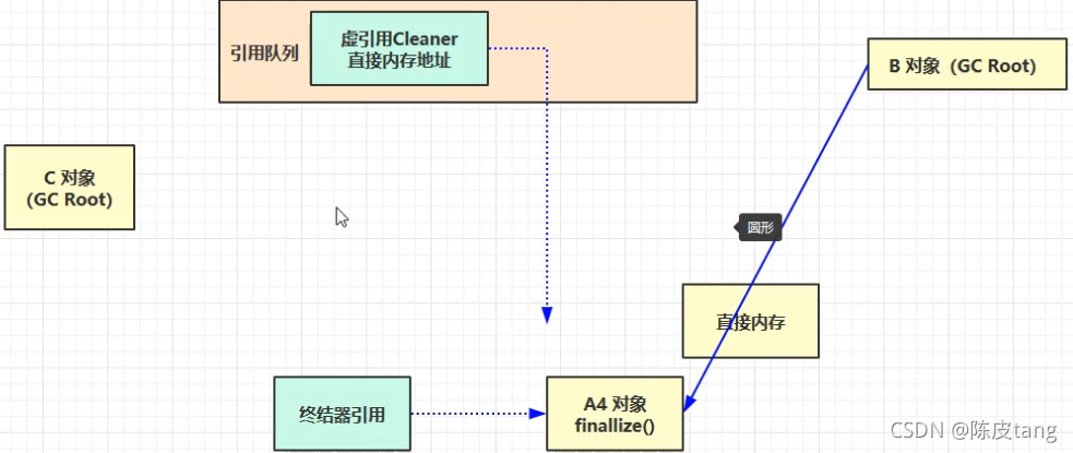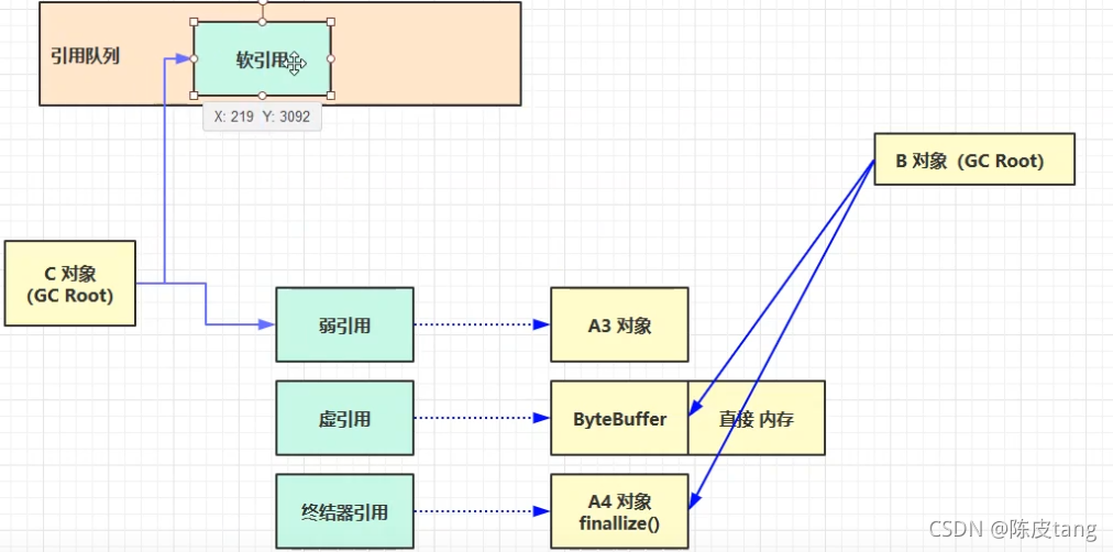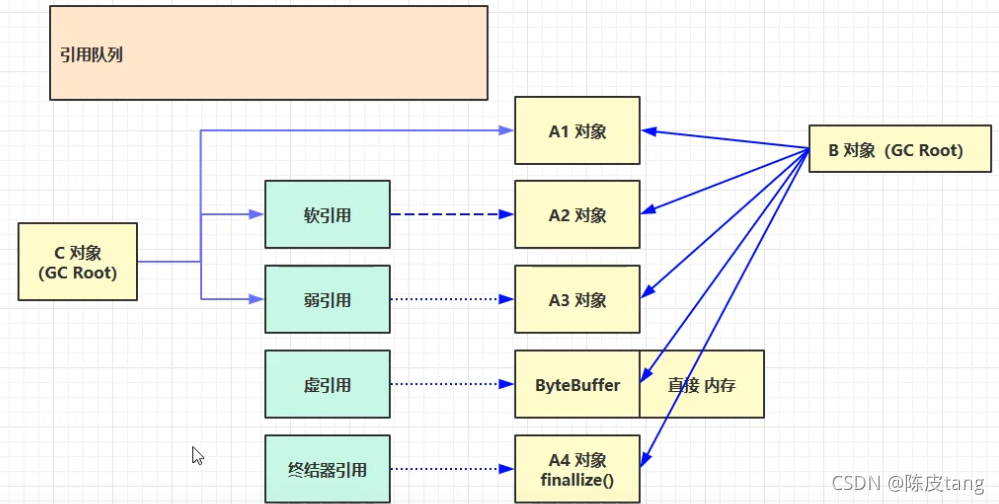 ??? 强引用 ??? 只有所有 GC Roots 对象都不通过【强引用】引用该对象,该对象才能被垃圾回收,由跟对象指向该对象的强引用都没了。 ??? 软引用(SoftReference) ??? 仅有软引用引用该对象时,在垃圾回收后,内存仍不足时会再次出发垃圾回收,回收软引用对象 ??? 可以配合引用队列来释放软引用自身,(当软引用对象被回收后,软引用自身被放入应用队列,因为应用自身占用内存,对其占用内存可以通过应用队列来释放,遍历应用队列,可以释放,则释放) ??? 弱引用(WeakReference) ??? 仅有弱引用引用该对象时,在垃圾回收时,无论内存是否充足,都会回收弱引用对象 ??? 可以配合引用队列来释放弱引用自身(当弱引用对象被回收后,弱引用自身被放入应用队列,) ??? 虚引用(PhantomReference) ??? 必须配合引用队列使用,主要配合 ByteBuffer 使用,被引用对象回收时,会将虚引用(Cleaner)入队,遍历队列,由 Reference Handler 线程调用虚引用相关方法(Unsafe.freeMenory)释放直接内存。 ??? 终结器引用(FinalReference) ??? Object类中有finallize,对象重写了终结方法,且没有强引用,说明要回收,无需手动编码,但其内部配合引用队列使用,在垃圾回收时,终结器引用入队(被引用对象暂时没有被回收,即不能一次回收,处理队列的线程优先级很低,被执行概率低,导致对象不被及时收回,效率低),再由 Finalizer 线程通过终结器引用找到被引用对象并调用它的 finalize 方法,第二次 GC 时才能回收被引用对象。(不推荐)