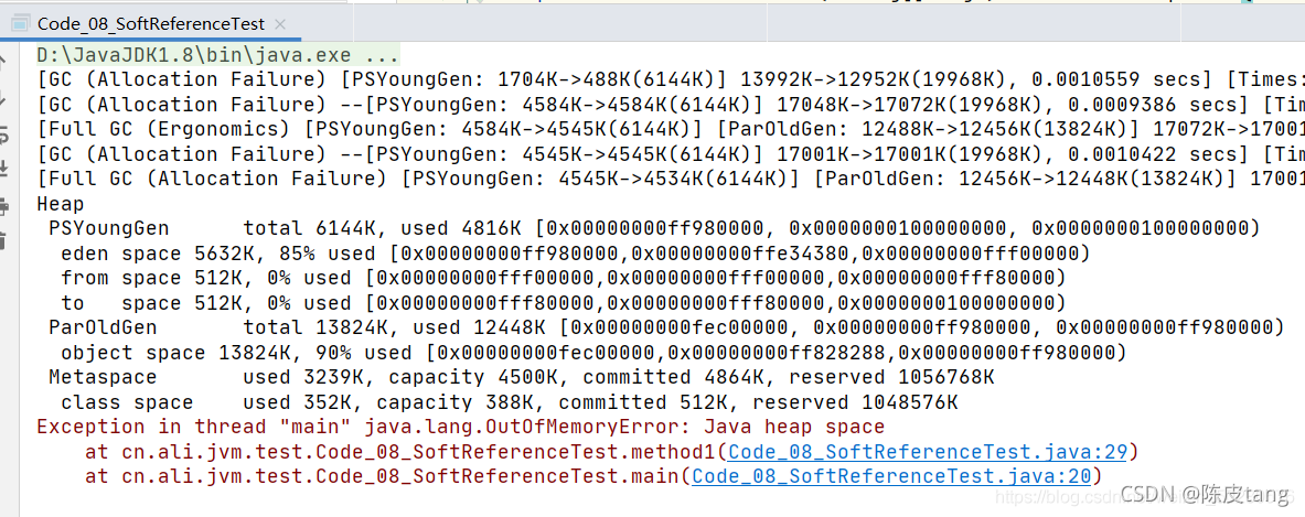 method1 方法解析: 首先会设置一个堆内存的大小为 20m,然后运行 mehtod1 方法,会抛异常,堆内存不足,因为 mehtod1 中的 list 都是强引用。