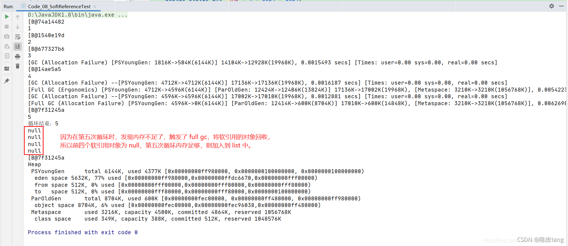 method2 方法解析: 在 list 集合中存放了 软引用对象,当内存不足时,会触发 full gc(触发了全面的垃圾回收),将软引用的对象回收。细节如图: