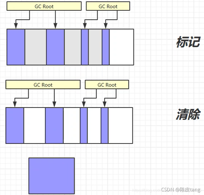 2、垃圾回收算法:标记清除(快,内存碎片),标记整理(慢,没有内存碎片,存活多),复制(没有内存碎片,占用两倍空间,存活小) 1)标记清除: