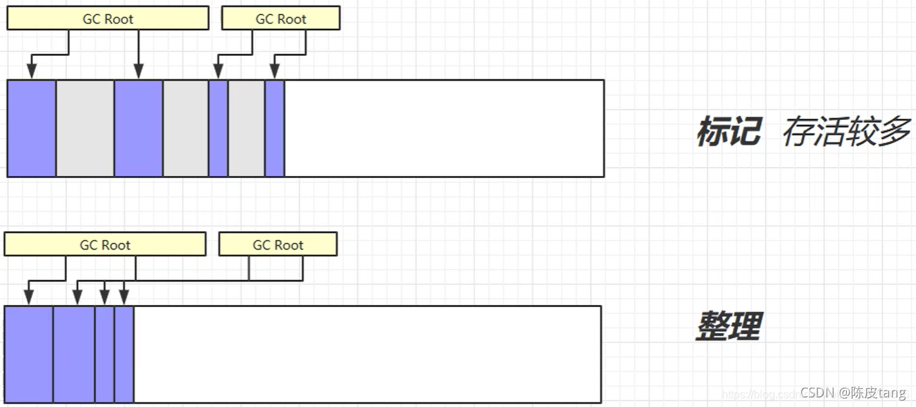整理阶段 使内存连续,在清出垃圾内存的同时,把可用对象前移(移动费时,内存区块的拷贝移动,索引的修改),使内存连续;