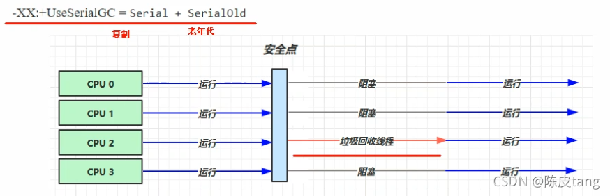 安全点:让其他线程都在这个点停下来,以免垃圾回收时移动对象地址,使得其他线程找不到被移动的对象 因为是串行的,所以只有一个垃圾回收线程。且在该线程执行回收工作时,其他线程进入阻塞状态