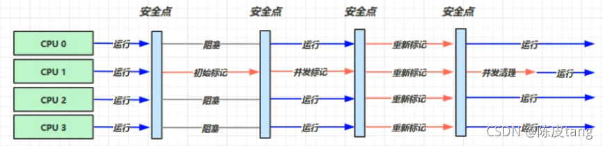?开启的是-XX:+UseParallelGC ~ -XX:+UsePrallerOldGC,CPU运行到安全点后,开启多个垃圾回收线程,同时运行,其他线程同样阻塞直到垃圾回收完成。