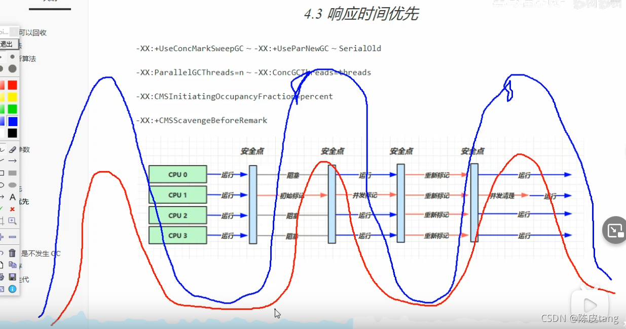 响应时间是快了,但是吞吐量减少,因为分了一部分CPU资源给垃圾回收