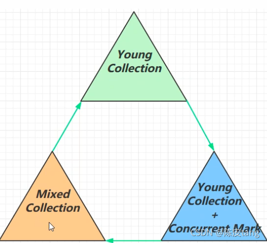 三个阶段循环。 Young Collection:对新生代垃圾收集 Young Collection + Concurrent Mark:如果老年代内存到达一定的阈值了,新生代垃圾收集同时会执行一些并发的标记。 Mixed Collection :会对新生代 + 老年代 + 幸存区等进行混合收集,然后收集结束,会重新进入新生代收集。