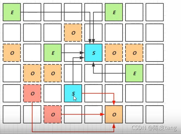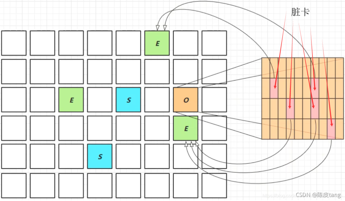 ??? 新生代回收的跨代引用(老年代引用新生代)问题 ???  ??? 卡表 与 Remembered Set ??????? Remembered Set 存在于E中,用于保存新生代对象对应的脏卡,回收新生代时通过Remembered Set来获取其老年代中对应脏卡信息。 ??????????? 脏卡:O 被划分为多个区域(一个区域512K),如果该区域引用了新生代对象,则该区域被称为脏卡 ??? 在引用变更时通过 post-write barried + dirty card queue() ??? concurrent refinement threads 更新 Remembered Set(异步 不是立刻更新,先放脏卡队列,将来有一个线程完成更新)