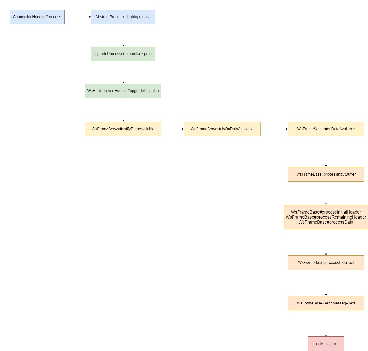 客户端来了消息,由连接器的Poller轮询监测socket底层是否有数据到来,有数据可读,则封装成一个SocketProcessor 扔到线程池里处理,org.apache.coyote.http11.upgrade.UpgradeProcessorInternal#dispatch 具有处理升级协议连接,org.apache.tomcat.websocket.server.WsHttpUpgradeHandler#upgradeDispatch 是专门处理WebSocket 连接的处理器。