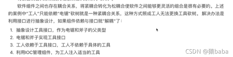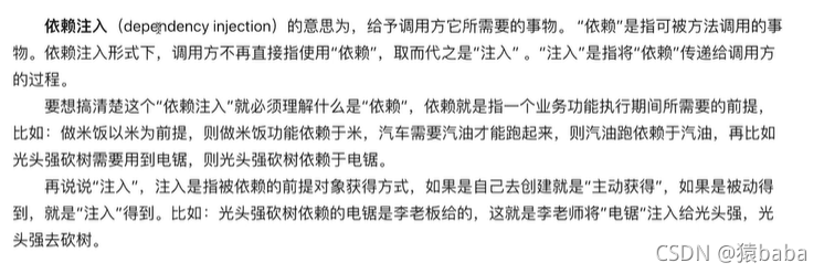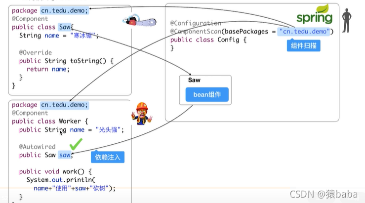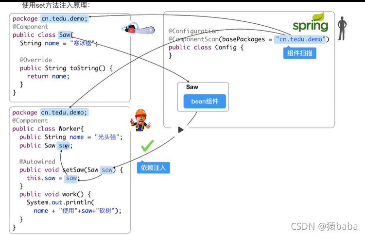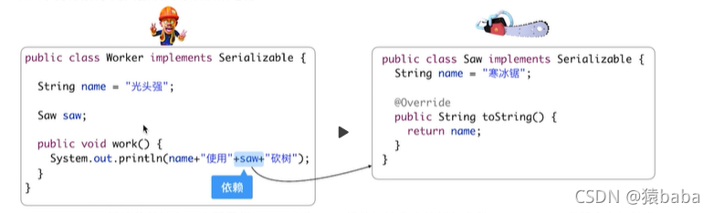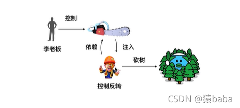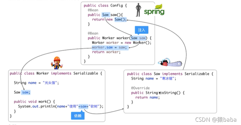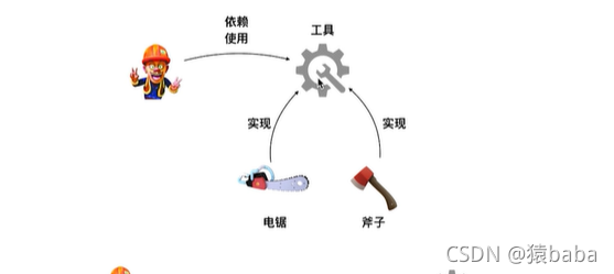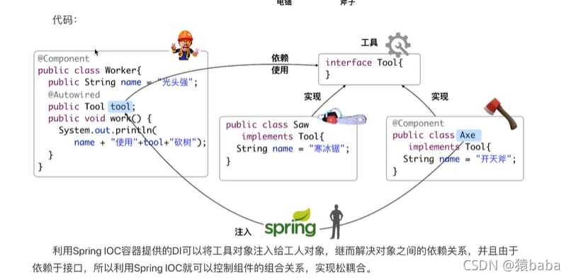 ? Spring IOC容器提供了依赖注入功能,可以将一个组件依赖的对象,在使用之前注入到合适位置.比如,如下关系模拟了光头强砍树时依赖电锯.