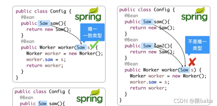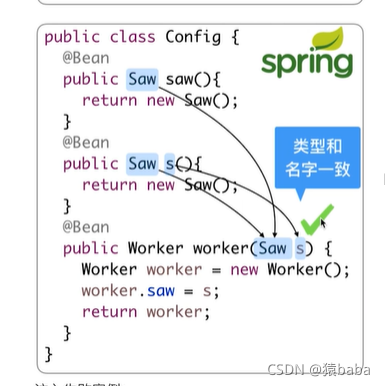 ? Spring IOC 解决依赖注入,在配置类Config中为Bean组件初始化方法增加参数,Spring IOC 容器会在初始化时,自动根据类型注入Bean组件对象,解决"依赖注入"问题:
