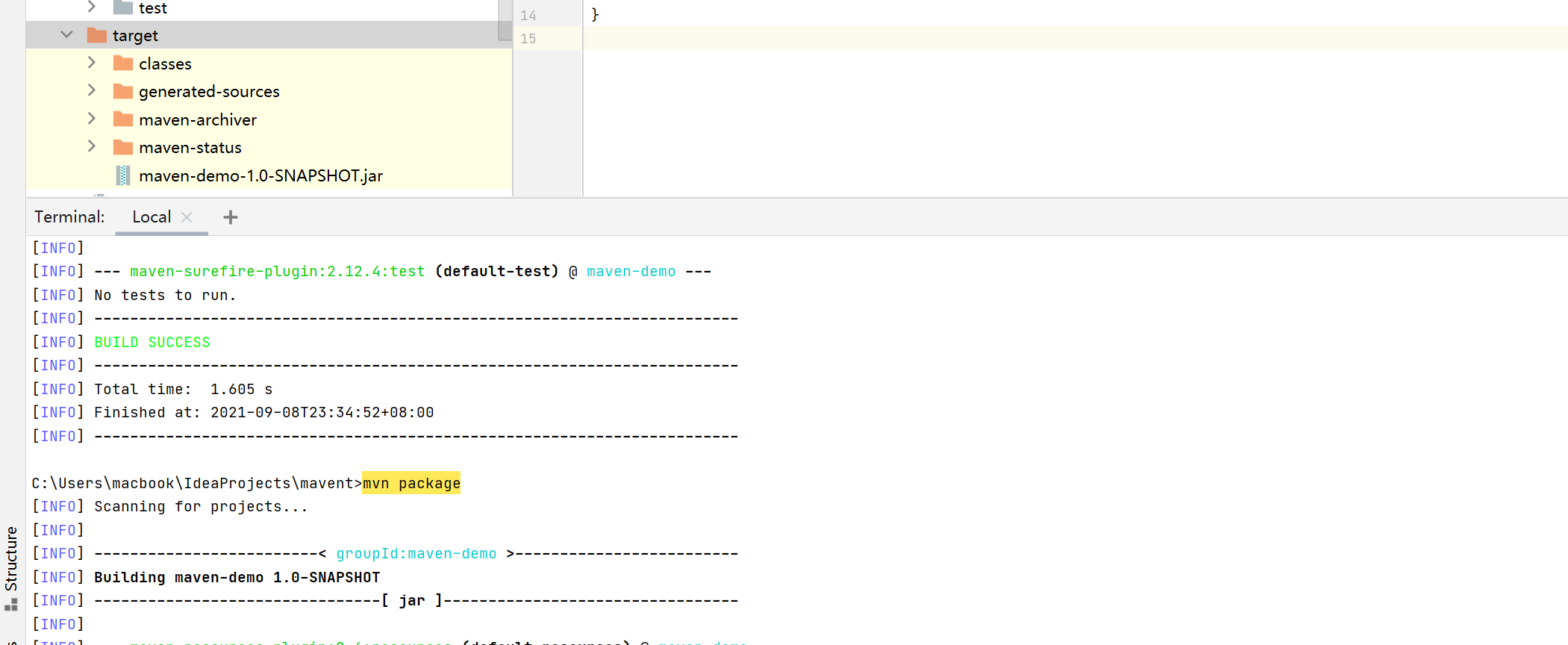 maven package,可以将我们项目打包成jar文件,生成jar文件在target路径下: