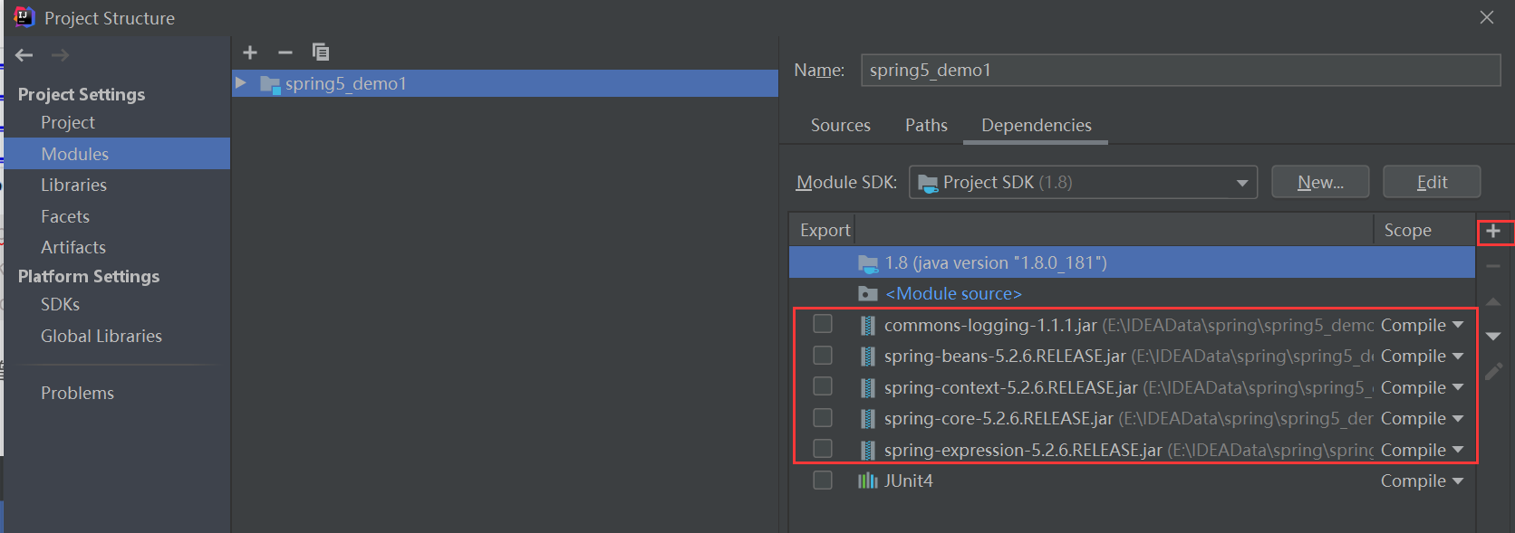 (1)下载Spring5,地址htt为ps://repo.spring.io/ui/native/release/org/springframework/spring/,选择版本5.26   (2)在IDEA中创建一个普通的Java工程,并且导入需要的jar包,需要注意的是其中的commons-logging-1.1.1.jar并不是Spring本身自带的,需要另外下载  此外还需要在项目中添加这些依赖  (3)编写代码 定义类User,并且定义方法add()