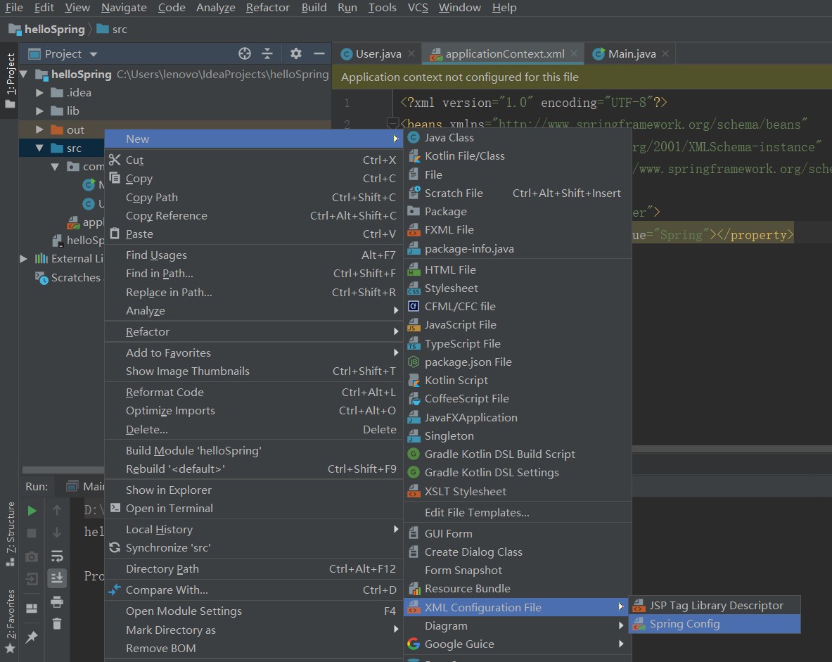创建一个配置文件,src->new->XML Configuration File->Spring Config,推荐命名为applicationContext