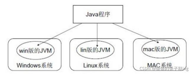 如图所示,Java的虚拟机本身是不具备跨平台功能的,每个操作系统下都有不同版本的虚拟机。