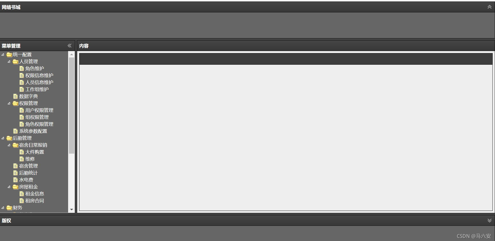 [{"id":"004","text":"统一配置","state":null,"checked":false,"attributes":{"self":{"serialNo":"1C63DA57E65243F184D6789A88E137B9","menuid":"004","menuname":"统一配置","menuURL":null,"parentid":"000"}},"children":[{"id":"004004","text":"人员管理","state":null,"checked":false,"attributes":{"self":{"serialNo":"269D9A1546E44A438AEA0513DFFA8D86","menuid":"004004","menuname":"人员管理","menuURL":null,"parentid":"004"}},"children":[{"id":"004004001","text":"角色维护","state":null,"checked":false,"attributes":{"self":{"serialNo":"365C214ED29841E0900BA7D0EECEE4FE","menuid":"004004001","menuname":"角色维护","menuURL":"jsp/config/userManage/roleInfo","parentid":"004004"}},"children":[],"parentId":"004004","hasParent":true,"hasChildren":false},{"id":"004004004","text":"权限信息维护","state":null,"checked":false,"attributes":{"self":{"serialNo":"79D5736B5D2B4427AE5D1DC2D9F3F414","menuid":"004004004","menuname":"权限信息维护","menuURL":"jsp/config/userManage/authInfo","parentid":"004004"}},"children":[],"parentId":"004004","hasParent":true,"hasChildren":false},{"id":"004004003","text":"人员信息维护","state":null,"checked":false,"attributes":{"self":{"serialNo":"90A28BFD207744428C623182701113BC","menuid":"004004003","menuname":"人员信息维护","menuURL":"jsp/userManage.jsp","parentid":"004004"}},"children":[],"parentId":"004004","hasParent":true,"hasChildren":false},{"id":"004004002","text":"工作组维护","state":null,"checked":false,"attributes":{"self":{"serialNo":"E51F9D7EDF7648E9A641100A10DD5D67","menuid":"004004002","menuname":"工作组维护","menuURL":"jsp/config/userManage/groupInfo","parentid":"004004"}},"children":[],"parentId":"004004","hasParent":true,"hasChildren":false}],"parentId":"004","hasParent":true,"hasChildren":true},{"id":"004001","text":"数据字典","state":null,"checked":false,"attributes":{"self":{"serialNo":"49EB2A822E03457498A0A19F9956AE2B","menuid":"004001","menuname":"数据字典","menuURL":"jsp/config/dataDict","parentid":"004"}},"children":[],"parentId":"004","hasParent":true,"hasChildren":false},{"id":"004003","text":"权限管理","state":null,"checked":false,"attributes":{"self":{"serialNo":"7B63D97C1B2C4D8896AB3648B065CCD1","menuid":"004003","menuname":"权限管理","menuURL":null,"parentid":"004"}},"children":[{"id":"004003003","text":"用户权限管理","state":null,"checked":false,"attributes":{"self":{"serialNo":"059CB9B033C247A1AD4B3F0E78C0ED55","menuid":"004003003","menuname":"用户权限管理","menuURL":"jsp/userManage.jsp","parentid":"004003"}},"children":[],"parentId":"004003","hasParent":true,"hasChildren":false},{"id":"004003002","text":"组权限管理","state":null,"checked":false,"attributes":{"self":{"serialNo":"57BC4AB9F93741ACBBD2BDEC71538653","menuid":"004003002","menuname":"组权限管理","menuURL":"jsp/config/groupAuthorityManage","parentid":"004003"}},"children":[],"parentId":"004003","hasParent":true,"hasChildren":false},{"id":"004003001","text":"角色权限管理","state":null,"checked":false,"attributes":{"self":{"serialNo":"DA05BB54E33845C4922A586B88C48205","menuid":"004003001","menuname":"角色权限管理","menuURL":"jsp/config/roleAuthorityManage","parentid":"004003"}},"children":[],"parentId":"004003","hasParent":true,"hasChildren":false}],"parentId":"004","hasParent":true,"hasChildren":true},{"id":"004002","text":"系统参数配置","state":null,"checked":false,"attributes":{"self":{"serialNo":"D0D2C27E371B491DB1099E50B2D0A8DA","menuid":"004002","menuname":"系统参数配置","menuURL":"jsp/config/systemParamCfg","parentid":"004"}},"children":[],"parentId":"004","hasParent":true,"hasChildren":false}],"parentId":"000","hasParent":false,"hasChildren":true},{"id":"002","text":"后勤管理","state":null,"checked":false,"attributes":{"self":{"serialNo":"20137C05907C42C7B488F9208E6FDDFE","menuid":"002","menuname":"后勤管理","menuURL":null,"parentid":"000"}},"children":[{"id":"002004","text":"宿舍日常报销","state":null,"checked":false,"attributes":{"self":{"serialNo":"1F560F60BAFA488B9D95E793226A1CE7","menuid":"002004","menuname":"宿舍日常报销","menuURL":null,"parentid":"002"}},"children":[{"id":"002004002","text":"大件购置","state":null,"checked":false,"attributes":{"self":{"serialNo":"391B22000A874FF7B27298E3B4AC1487","menuid":"002004002","menuname":"大件购置","menuURL":"jsp/support/largeThingInfo","parentid":"002004"}},"children":[],"parentId":"002004","hasParent":true,"hasChildren":false},{"id":"002004001","text":"维修","state":null,"checked":false,"attributes":{"self":{"serialNo":"BC03322D761841F08859350D1C4B0ECA","menuid":"002004001","menuname":"维修","menuURL":"jsp/support/repairInfo","parentid":"002004"}},"children":[],"parentId":"002004","hasParent":true,"hasChildren":false}],"parentId":"002","hasParent":true,"hasChildren":true},{"id":"002001","text":"宿舍管理","state":null,"checked":false,"attributes":{"self":{"serialNo":"85EBB07BE0B349D3B3AD1B50ED546E00","menuid":"002001","menuname":"宿舍管理","menuURL":"jsp/support/roominfo","parentid":"002"}},"children":[],"parentId":"002","hasParent":true,"hasChildren":false},{"id":"002005","text":"后勤统计","state":null,"checked":false,"attributes":{"self":{"serialNo":"9C660197D7B44BE584101F286AC4DC8A","menuid":"002005","menuname":"后勤统计","menuURL":"jsp/support/totalInfo","parentid":"002"}},"children":[],"parentId":"002","hasParent":true,"hasChildren":false},{"id":"002002","text":"水电费","state":null,"checked":false,"attributes":{"self":{"serialNo":"C9A01427553848449C76864118A014E6","menuid":"002002","menuname":"水电费","menuURL":"jsp/support/waterElectricity","parentid":"002"}},"children":[],"parentId":"002","hasParent":true,"hasChildren":false},{"id":"002003","text":"房屋租金","state":null,"checked":false,"attributes":{"self":{"serialNo":"D4E33EF7C17747E9A52F765A71CBDABE","menuid":"002003","menuname":"房屋租金","menuURL":null,"parentid":"002"}},"children":[{"id":"002003002"