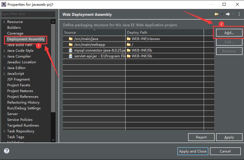 三、点击左侧的Deployment Assembly,打开Web Deployment Assembly选项,点击右侧的Add按钮