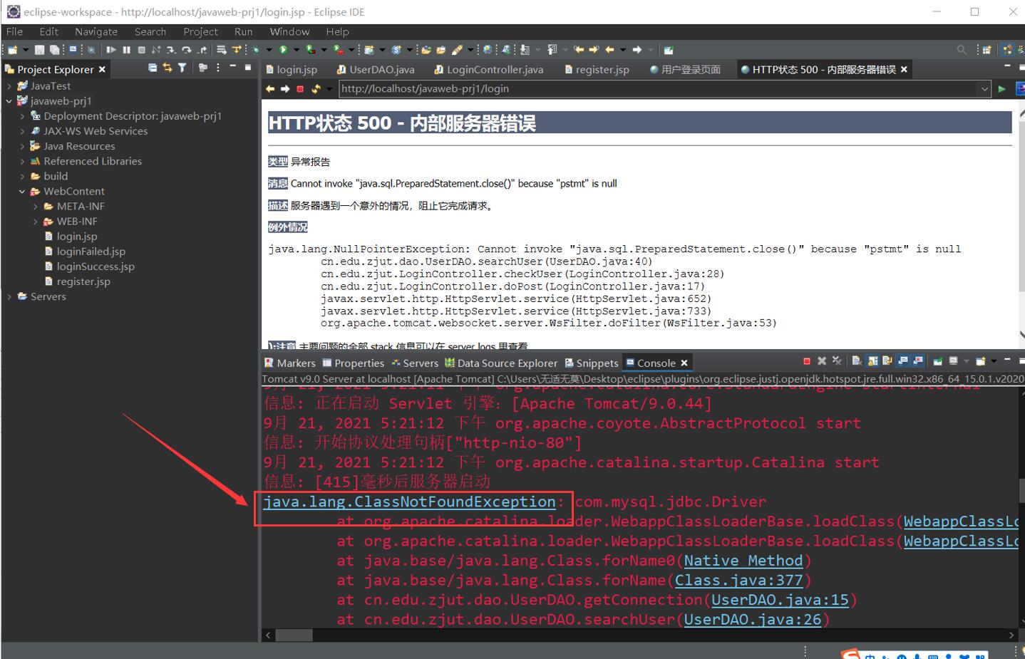 ? 这学期博主的同学在使用eclipse进行Java EE的学习的时候也遇到了同样的问题,再导入了链接MySQL数据库有关的mysql-connect-java.jar包之后仍然显示ClassNotFoundException,并且提示找不到对应的函数,如下图所示: