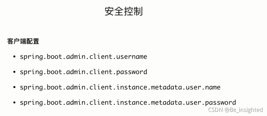 spring.boot.admin.client.url=http://localhost:8080 spring.boot.admin.client.username=geektime spring.boot.admin.client.password=sba-server-password
