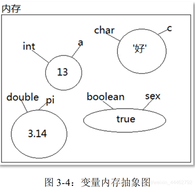 ?在上图当中每一个抽象的椭圆就代表一个变量,其中 a、c、pi、sex 是 4 个变量的名字(变量名只要是合法的标识符即可),13、?好?、3.14、true 是4个变量中分别存储的数据(字面 量),int、char、double、boolean 是 4 个变量分别对应的数据类型(int、char、double、boolean 等都是 java 的关键字,声明变量时用来指定变量的数据类型)。