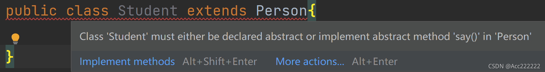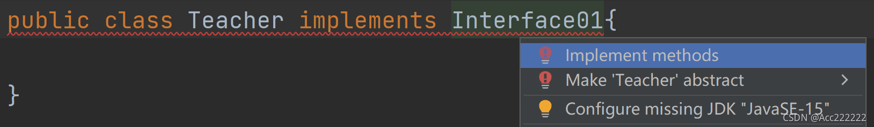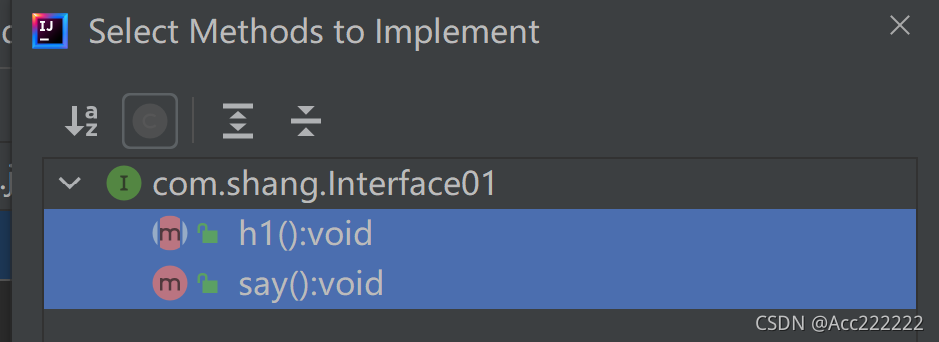 3. 一个普通类实现接口,就必须将该接口的所有抽象方法实现,快捷键:点击要实现接口的名字,按 Alt + Enter ,点击 Implement methods,然后选中要实现的方法。