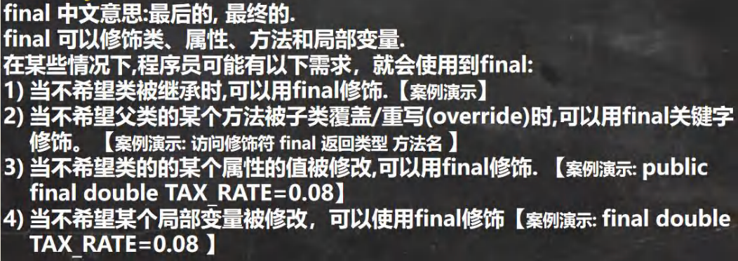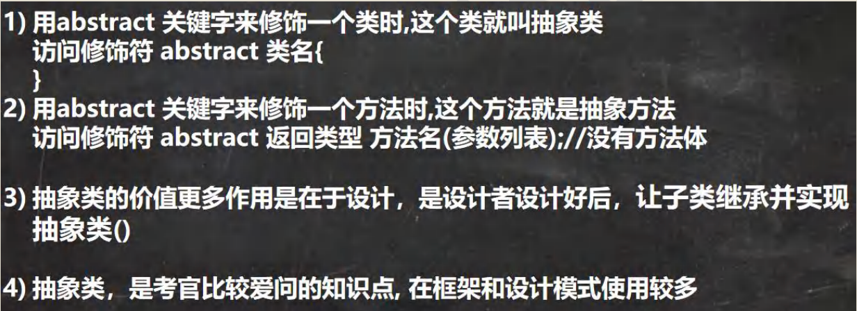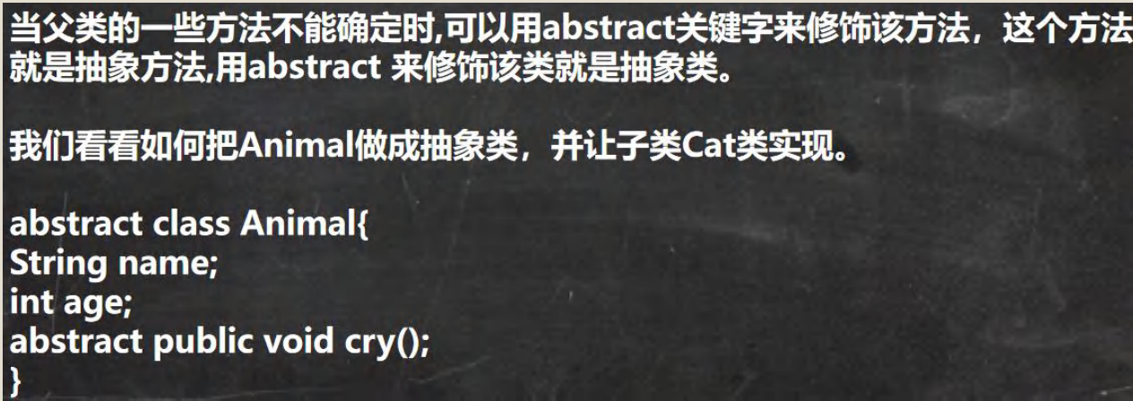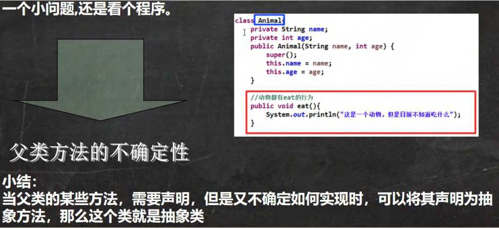//思考:这里 eat 这里你实现了,其实没有什么意义 //即: 父类方法不确定性的问题 //=> 考虑将该方法设计为抽象(abstract)方法 //=> 所谓抽象方法就是没有实现的方法 //=> 所谓没有实现就是指,没有方法体 //=> 当一个类中存在抽象方法时,需要将该类声明为 abstract 类 //===> 一般来说,抽象类会被继承,有其子类来实现抽象方法.