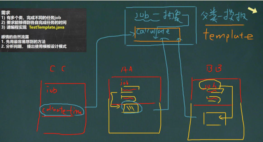 上面就是抽象类—模版设计模式, 只需要继承这个抽象类, 然后实现job方法,通过动态绑定机制。 就可以得到各自完成的时间。
