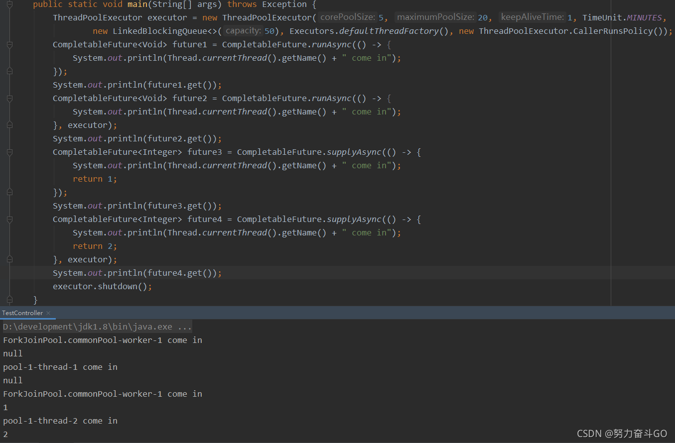 // CompletableFuture要使用自定义创建的线程池,如果使用默认的线程池,则主线程结束后默认的线程池就会销毁,异步线程的代码就不会执行
