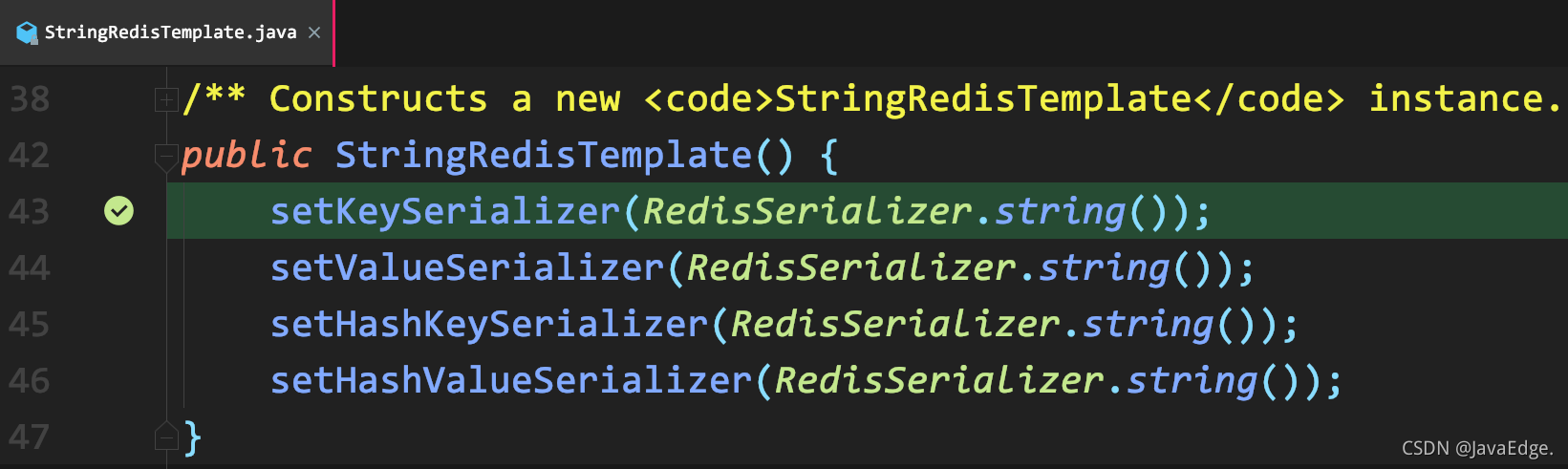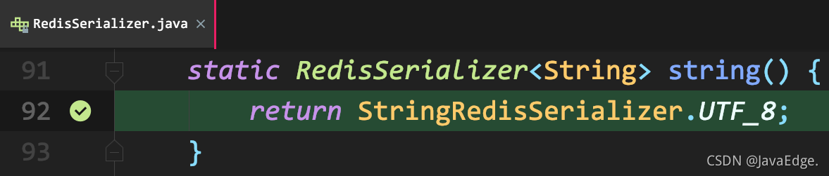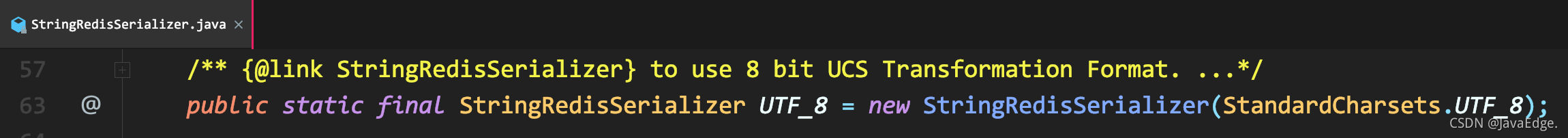 以 StringRedisSerializer 为例。StringRedisTemplate构造器直接指定了KeySerializer为 RedisSerializer.string():  RedisSerializer.string():