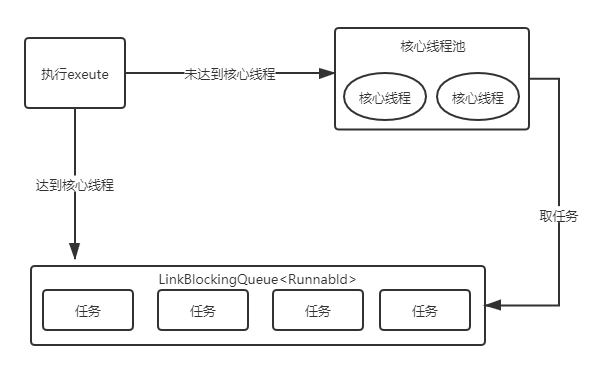 由图可知,当执行excute方法时,如果当前运行的线程未达到corePoolSize(核心线程数)时就创建核心线程来处理任务,如果达到了核心线程数则将任务添加到LinkBlockingQueue中。FixThreadPool 就是一个有固定数量核心线程的线程池,并且这些核心线程不会被回收。当线程数超过corePoolSize时,就将任务存储在任务队列中;当线程池有空闲线程时,则从任务队列中去取任务执行。