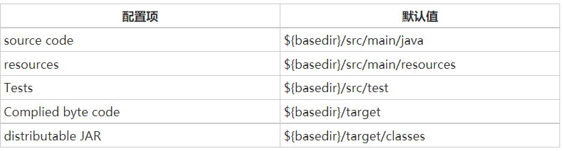 下面的表格展示了工程源码文件、资源文件的默认配置,和其他一些配置。假定 ${basedir} 表示工程目录: