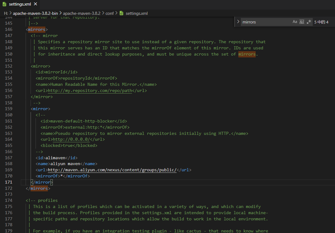 <localRepository>本地仓库的实际路径</localRepository>  往下面找到在里面修改内容,