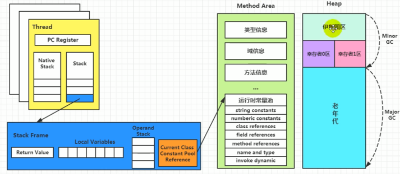 2.5 (拼多多)JVM内存分哪几个区?每个区的作用是什么? JVM本质上是由指令、数据、控制组成一个操作系统,主要功能包括翻译和内存管理。 方法区:存储加载到内存中的字节码信息(类信息,域信息,方法信息,运行时常量池) 堆:存储所有运行时对象,作用是存储数据及内存管理 虚拟机栈:存储以方法为单位的栈帧,配合程序计数器进行程序执行控制 程序计数器:存储线程当前执行的字节码地址和行号,程序执行控制 本地方法栈:和系统底层交互,使用系统提供的基础能力。