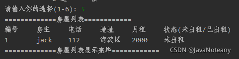 //编号 房主 电话 地址 月租 状态(未出租/已出租)